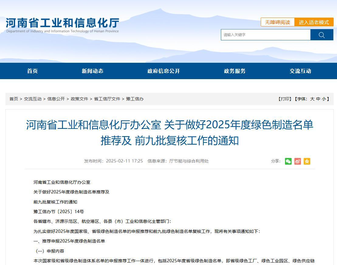 為推動(dòng)河南省綠色制造體系的不斷完善,綠色制造水平的穩(wěn)步提高,河南省及各地市先后出臺(tái)了一系列政策文件。省工信廳組織開展2025年度河南省綠色工廠、綠色工業(yè)園區(qū)申報(bào)工作。