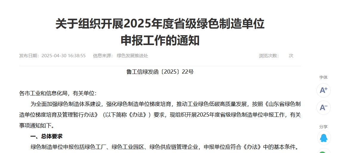 為全面加強綠色制造體系建設(shè),強化綠色制造單位梯度培育,推動工業(yè)綠色低碳高質(zhì)量發(fā)展,按照《山東省綠色制造單位梯度培育及管理暫行辦法》(以下簡稱《辦法》)要求,現(xiàn)組織開展2025年度山東省綠色工廠、綠色工業(yè)園區(qū)申報工作。